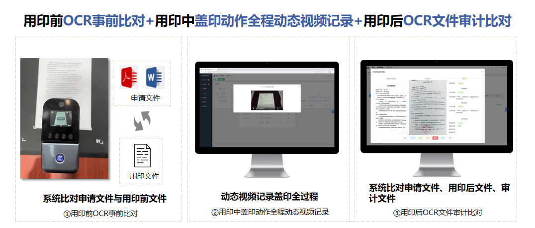 使用物聯(lián)網(wǎng)技術(shù)和人工智能技術(shù),實(shí)現(xiàn)對實(shí)物印章用印申請、審批、用印過程全流程管控,并實(shí)現(xiàn)用印前后文件內(nèi)容AI對比,有效防止文件調(diào)換和篡改。智能印章管理使人、印章、文件和管理系統(tǒng)完全關(guān)聯(lián)融合,徹底封堵印章管理漏洞,提高管理效率保障內(nèi)控安全,從而高智能幫助企事業(yè)單位有效地把控用章風(fēng)險(xiǎn)。