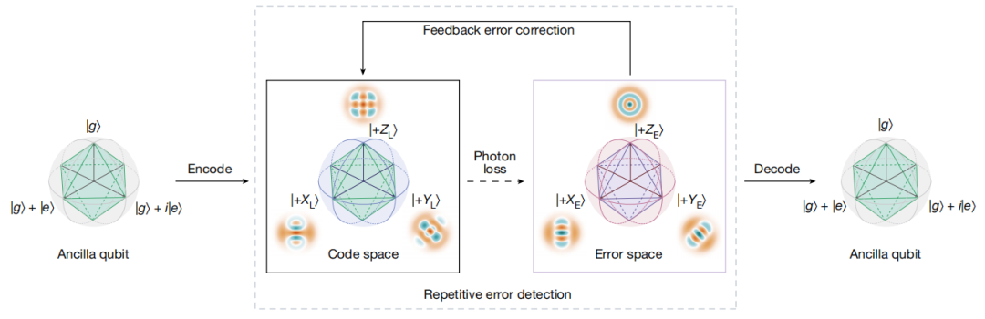 為攻克上述難題,聯(lián)合研究團隊利用微波簡諧振子或玻色模式系統(tǒng)中的無窮維希爾伯特空間,實現(xiàn)量子信息的冗余編碼與量子糾錯。在超導(dǎo)量子線路系統(tǒng)中,基于玻色編碼的量子糾錯方案具有錯誤類型簡單、錯誤探測方便、相干性能好、硬件更高效、反饋控制易實現(xiàn)等優(yōu)點。
