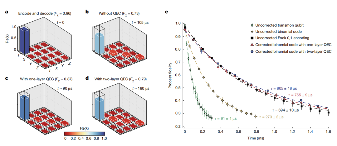 本研究工作中,研究團隊通過開發(fā)高相干性能的量子系統(tǒng),設(shè)計和實現(xiàn)低錯誤率的錯誤癥狀探測方法,以及改進(jìn)和優(yōu)化量子糾錯技術(shù)等實驗手段,最終在玻色模式中實現(xiàn)了基于離散變量的二項式編碼的邏輯量子比特,并通過實時重復(fù)的量子糾錯過程,延長了量子信息的存儲時間,相關(guān)結(jié)果首次超過該系統(tǒng)中不糾錯情況下的最好值,也就是突破了盈虧平衡點。這也是國際上首次通過主動的重復(fù)錯誤探測和糾錯過程實現(xiàn)延長量子信息的存儲時間超越盈虧平衡點,具有里程碑式的重要意義。