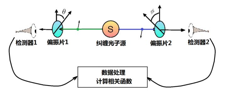 愛因斯坦構(gòu)想了一個(gè)思想實(shí)驗(yàn),描述了一個(gè)不穩(wěn)定的大粒子衰變成兩個(gè)小粒子(A和B)的情況:大粒子分裂成兩個(gè)同樣的小粒子。小粒子獲得動(dòng)能,分別向相反的兩個(gè)方向飛出去。如果粒子A的自旋為上,粒子B的自旋便一定是下,才能保持總體的自旋守恒,反之亦然。根據(jù)量子力學(xué)的說(shuō)法,測(cè)量前兩個(gè)粒子應(yīng)該處于疊加態(tài),比如“A上B下”和“A下B上”各占一定概率的疊加態(tài)(例如,概率各為50%)。然后,我們對(duì)A進(jìn)行測(cè)量,A的狀態(tài)便在一瞬間坍縮了,如果A的狀態(tài)坍縮為上,因?yàn)槭睾愕木壒?,B的狀態(tài)就一定為下。但是,假如A和B之間已經(jīng)相隔非常遙遠(yuǎn),比如說(shuō)幾萬(wàn)光年,按照量子力學(xué)的理論,B也應(yīng)該是上下各一半的概率,為什么它能夠在A坍縮的那一瞬間,做到總是選擇下呢?難道A和B之間有某種方式及時(shí)地“互通消息”?即使假設(shè)它們能夠互相感知,它們之間傳遞的信號(hào)需要在一瞬間跨越幾萬(wàn)光年,這個(gè)傳遞速度已經(jīng)超過(guò)了光速,而這種超距作用又是現(xiàn)有的物理知識(shí)不容許的。于是,愛因斯坦認(rèn)為:這就構(gòu)成了佯謬。愛因斯坦強(qiáng)調(diào)不可能有超距作用,意味著他堅(jiān)持經(jīng)典理論的“局域性”。量子力學(xué)已經(jīng)否定了確定性,這是愛因斯坦不認(rèn)可的。而現(xiàn)在,如果連局域性都要拋棄,這可是愛因斯坦絕對(duì)不能同意的,因而在文章中他將兩個(gè)粒子間瞬時(shí)的相互作用稱為“幽靈般的超距作用”。薛定諤讀完EPR論文之后,他用德文寫了一封信給愛因斯坦,在這封信里,他最先使用了術(shù)語(yǔ)Verschr?nkung(意思是糾纏),這是為了要形容在EPR思想實(shí)驗(yàn)里,兩個(gè)暫時(shí)耦合的粒子,不再耦合之后彼此之間仍舊維持的關(guān)聯(lián)。EPR佯謬也得到了玻爾的回應(yīng)。他認(rèn)為,因?yàn)閮蓚€(gè)粒子形成了一個(gè)互相糾纏的整體,只有用波函數(shù)描述的整體才有意義,不能將它們視為相隔甚遠(yuǎn)的兩個(gè)個(gè)體——既然是協(xié)調(diào)相關(guān)的一體,它們之間便無(wú)須傳遞什么信息。愛因斯坦絕對(duì)接受不了玻爾的這種古怪的說(shuō)法,即使在之后的二三十年中,玻爾的理論占了上風(fēng),量子理論如日中天,各個(gè)分支高速發(fā)展,給人類社會(huì)帶來(lái)偉大的技術(shù)革命,愛因斯坦仍然固執(zhí)地堅(jiān)持他的經(jīng)典信念,反對(duì)哥本哈根學(xué)派對(duì)量子理論的詮釋。1955年,愛因斯坦與世長(zhǎng)辭,幾年后玻爾也離開了人世。但他們觀點(diǎn)的分歧依然沒有一個(gè)定論,直到1964年英國(guó)物理學(xué)家約翰·貝爾提出了著名的“貝爾不等式”。愛因斯坦一方堅(jiān)持認(rèn)為量子糾纏的隨機(jī)性是表面現(xiàn)象,背后可能藏有“隱變量”,貝爾本人也支持這個(gè)觀點(diǎn)。他試圖用實(shí)驗(yàn)來(lái)證明愛因斯坦的隱變量觀點(diǎn)是正確的。貝爾假設(shè)了一個(gè)上圖所示的實(shí)驗(yàn)。根據(jù)出生確定論,這些光子的偏振方向都是已經(jīng)確定好了的,對(duì)一個(gè)光子的測(cè)量結(jié)果和對(duì)另一個(gè)光子的測(cè)量結(jié)果無(wú)關(guān)。但在量子力學(xué)中,對(duì)一個(gè)光子的測(cè)量結(jié)果必然影響另一個(gè)光子的測(cè)量結(jié)果。比如做4次實(shí)驗(yàn),分別把左右兩邊的偏振片置于(0°, 0°)、(30°, 0°)、(0°, -30°)、(30°, -30°)的角度。第一種情況,所有的光子都能通過(guò)偏振片。第二、三種情況,是分別選擇每一邊的偏振片。第四種情況,是兩邊的偏振片都旋轉(zhuǎn)。簡(jiǎn)單來(lái)說(shuō),如果對(duì)一個(gè)光子的測(cè)量結(jié)果和對(duì)另一個(gè)光子的測(cè)量結(jié)果無(wú)關(guān),那么兩邊的偏振片都旋轉(zhuǎn)的結(jié)果≤每一邊偏振片分別旋轉(zhuǎn)的結(jié)果之和,這就是貝爾不等式。但根據(jù)量子理論,對(duì)一個(gè)光子的測(cè)量結(jié)果必然影響另一個(gè)光子的測(cè)量結(jié)果。那么,就會(huì)出現(xiàn)兩邊的偏振片都旋轉(zhuǎn)的結(jié)果>每一邊偏振片分別旋轉(zhuǎn)的結(jié)果之和的情況。也就是說(shuō),如果該不等式成立,愛因斯坦獲勝,如果該不等式不成立,則玻爾獲勝。因此,貝爾不等式將愛因斯坦等人提出的EPR佯謬中的思想實(shí)驗(yàn),轉(zhuǎn)化為真實(shí)可行的物理實(shí)驗(yàn)。盡管貝爾的原意是支持愛因斯坦,找出量子系統(tǒng)中的隱變量,但他的不等式導(dǎo)致的實(shí)驗(yàn)結(jié)果卻適得其反。在之后的幾十年里,所有貝爾測(cè)試的實(shí)驗(yàn)結(jié)果都偏向于量子力學(xué)。1972年,物理學(xué)家克勞澤及其合作者弗里德曼,成為貝爾不等式實(shí)驗(yàn)驗(yàn)證的第一人。實(shí)驗(yàn)結(jié)果違背貝爾不等式,證明了量子力學(xué)的正確性。1982年,巴黎第十一大學(xué)的阿蘭·阿斯佩等人在貝爾的幫助下,改進(jìn)了克勞澤和弗里德曼的貝爾定理實(shí)驗(yàn),成功地堵住了部分主要漏洞。這次的實(shí)驗(yàn)結(jié)果同樣違反貝爾不等式,證明了量子力學(xué)的非局域性。