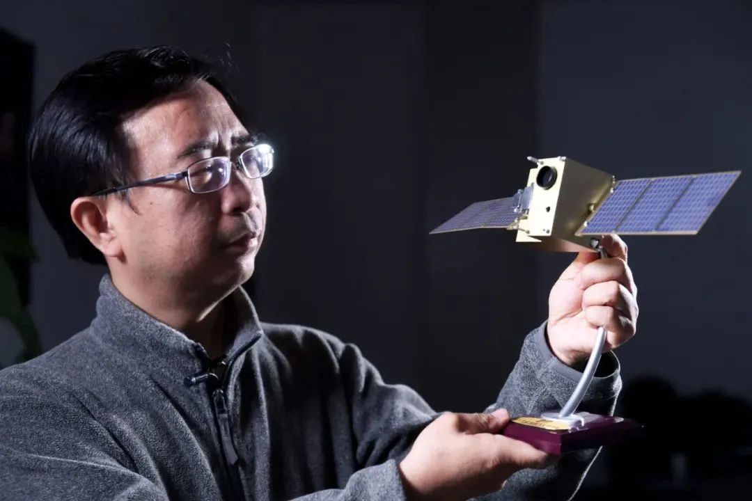 潘建偉在中國科學(xué)技術(shù)大學(xué)的辦公室內(nèi)與“墨子號”量子衛(wèi)星模型合影