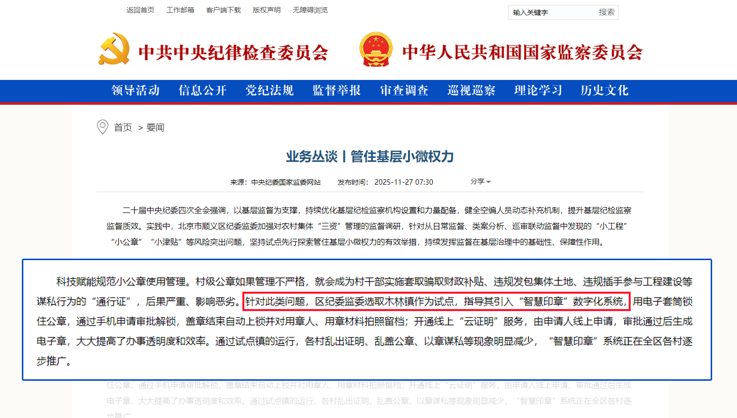 業(yè)務(wù)叢談丨管住基層小微權(quán)力摘要:村級公章如果管理不嚴(yán)格,就會(huì)成為村干部實(shí)施套取騙取財(cái)政補(bǔ)貼、違規(guī)發(fā)包集體土地、違規(guī)插手參與工程建設(shè)等謀私行為的“通行證”,后果嚴(yán)重、影響惡劣。針對此類問題,區(qū)紀(jì)委監(jiān)委選取木林鎮(zhèn)作為試點(diǎn),指導(dǎo)其引入“智慧印章”數(shù)字化系統(tǒng)。近日,中央紀(jì)委國家監(jiān)委網(wǎng)站在《業(yè)務(wù)…