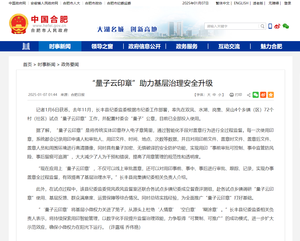 近日,安徽省合肥市長豐縣試點(diǎn)引入中電信量子集團(tuán)與云璽量子、科大國盾多年共同研發(fā)出的“量子云印章”管理體系,構(gòu)建了全新的村級印章管理模式,旨在實(shí)現(xiàn)基層治理和小微權(quán)力治理創(chuàng)新。此舉措引發(fā)了廣泛的關(guān)注,并得到了安徽紀(jì)檢監(jiān)察網(wǎng)、合肥市紀(jì)委監(jiān)委以及長豐縣紀(jì)檢監(jiān)察網(wǎng)等多個(gè)官方平臺的報(bào)道。原文如下:…