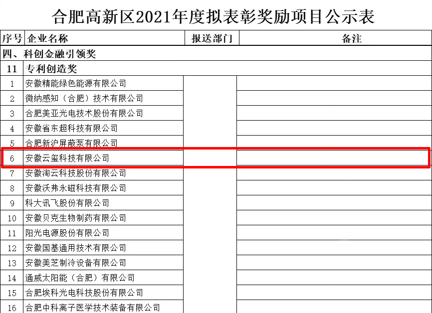 云璽量子·榮登榜單近日,合肥市高新區(qū)對(duì)2021年度擬表彰獎(jiǎng)勵(lì)項(xiàng)目做出了公示,安徽云璽量子科技有限公司喜登榜單,榮獲科創(chuàng)金融引領(lǐng)獎(jiǎng)中專(zhuān)利創(chuàng)造獎(jiǎng)。專(zhuān)利創(chuàng)造獎(jiǎng):①對(duì)當(dāng)年知識(shí)產(chǎn)權(quán)創(chuàng)造、運(yùn)用、管理、保護(hù)、服務(wù)突出的單位,給予獎(jiǎng)勵(lì);②對(duì)當(dāng)年獲得國(guó)家級(jí)、省級(jí)知識(shí)產(chǎn)權(quán)獎(jiǎng)項(xiàng)、榮譽(yù)的單位,給予獎(jiǎng)勵(lì);③對(duì)當(dāng)…