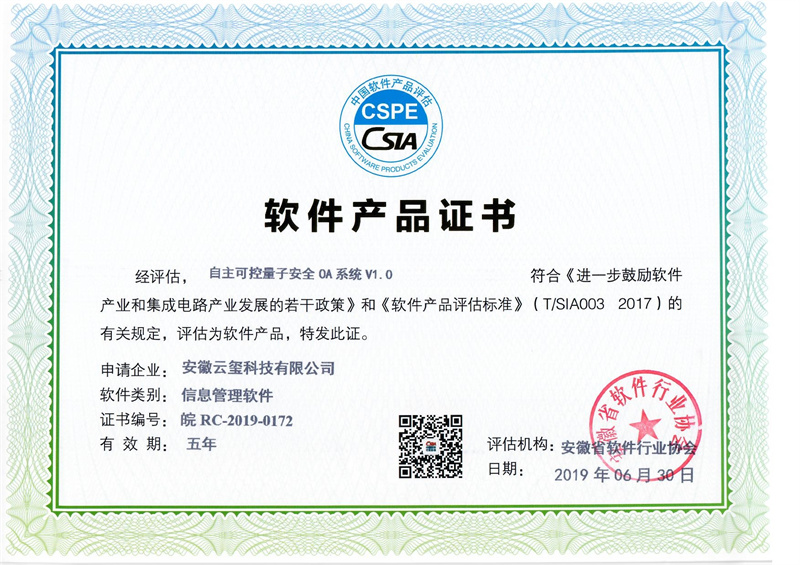 自主可控安 全OA系統(tǒng)軟件產(chǎn)品證書(shū)