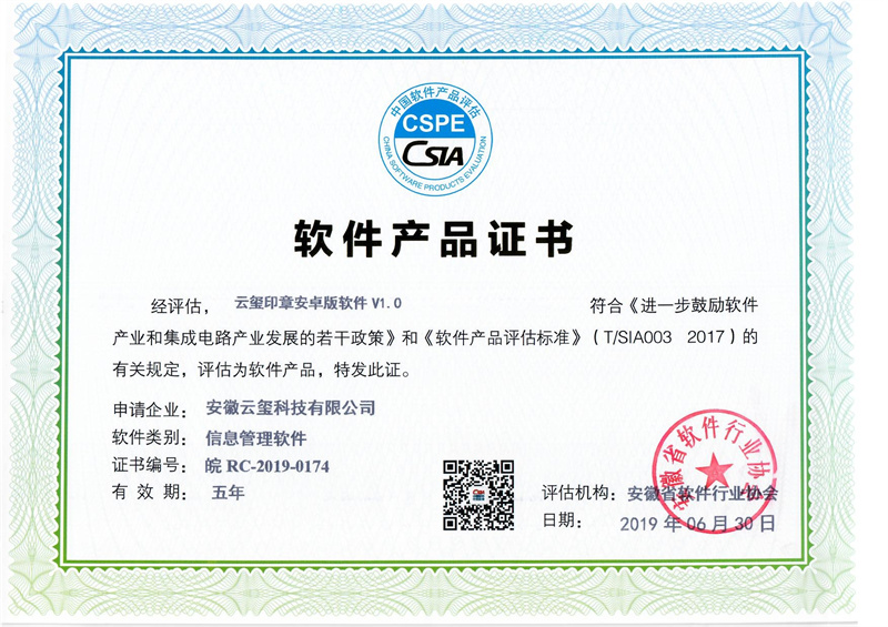 云璽印章安卓版軟件產(chǎn)品證書(shū)